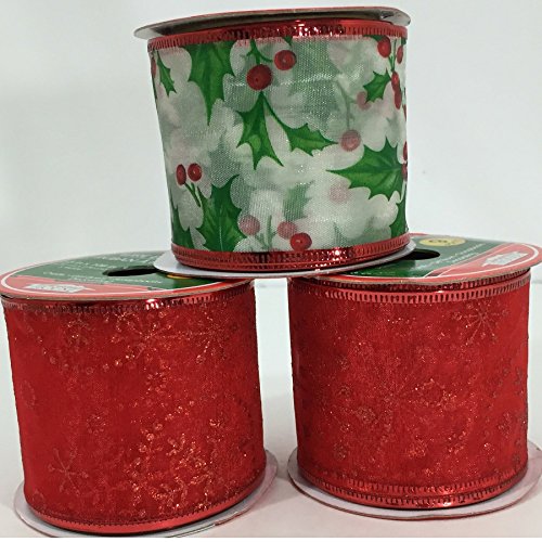Wired Ribbon Glittery Christmas House Set of 3 Red and Christmas Holly 2/5" By 9 Ft Total 27 Feet